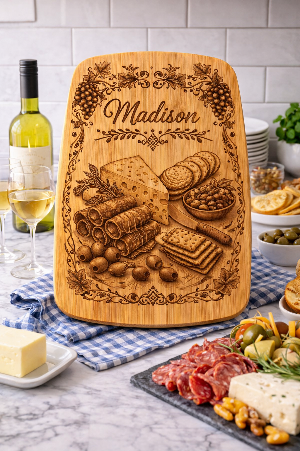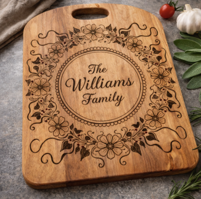 Add a personal touch to your kitchen or create a meaningful gift with a custom engraved charcuterie board. Designed for both beauty and function, each board is crafted from quality wood and engraved with precision to create a piece that’s perfect for entertaining or displaying.